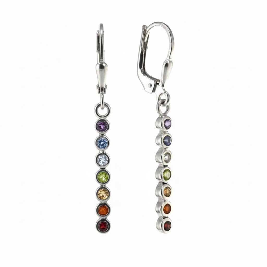Náušnice s čakrovými kameny ze 925 sterling silver (nebo v pozlacené verzi) spojují sedm drahokamů reprezentujících hlavní energetická centra těla. Jemné, ručně vyrobené šperky s výrazným barevným akcentem.
